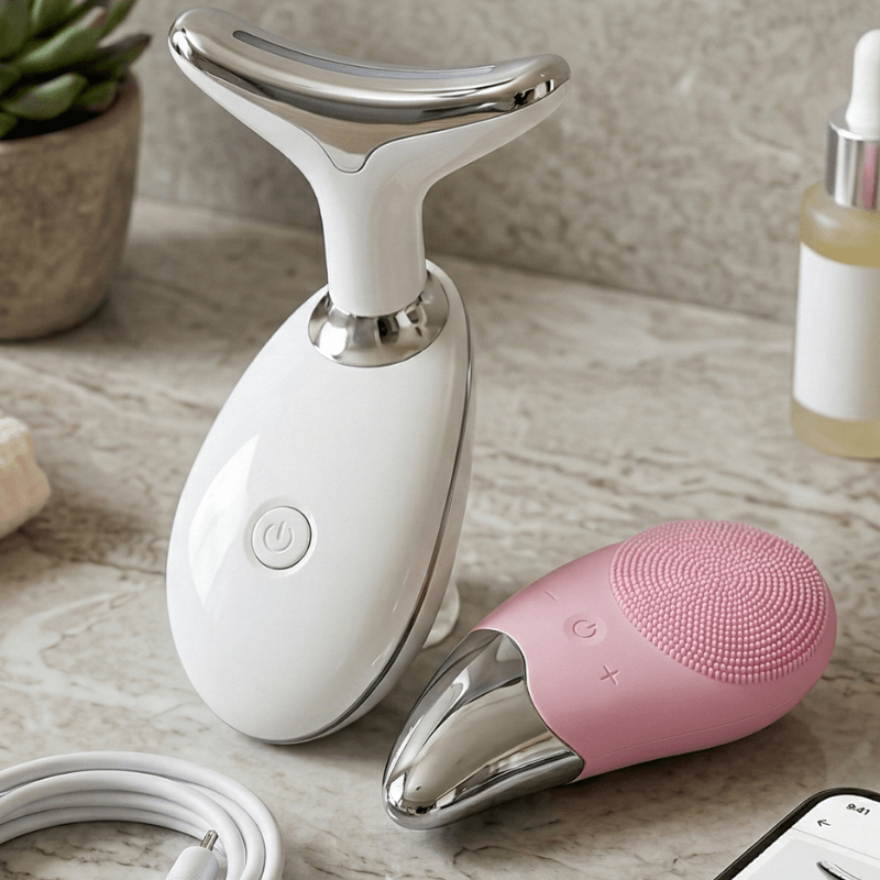 The bundle includes a 7-in-1 LED Facial Sculptor and a silicone facial cleansing brush for a simple yet effective skincare routine.